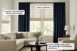 - Personalized Design: Custom window coverings open up a world of creative possibilities. You can explore a vast array of fabrics, textures, and color palettes to find an ideal match for your room’s existing décor or your evolving vision. This rich personalization allows you to achieve harmony or dramatic contrast, from subtle neutrals that promote tranquility to bold patterns and rich colors that anchor and energize your space.
